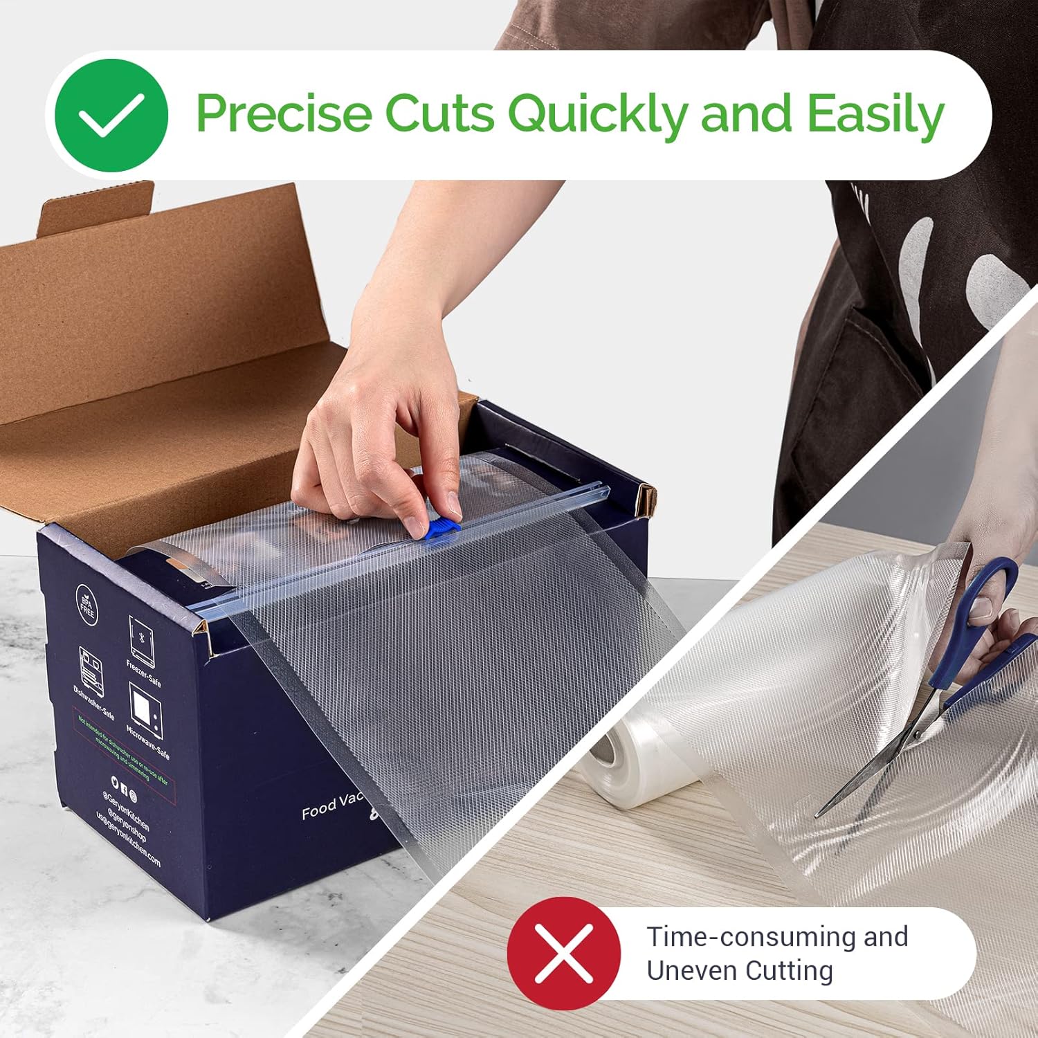 • 【Cutter Box with Closed Design】: is a great way to keep your Geryon vacuum sealer roll bags (11x120ft) organized. It allows for easy and precise cutting of the bags to the size you need, eliminating the need for scissors.